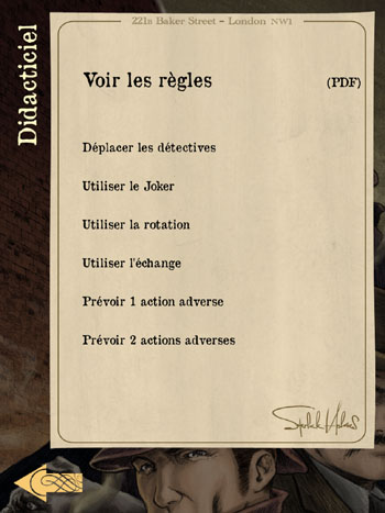 Toujours utile pour mieux comprendre les bases de la règle, le didacticiel est bien présent. Il comporte une première explication sous forme d’animation. On vous présente les suspects, les policiers, le plateau de jeu, les grands principes, chaque action possible en présentant les jetons actions un par un… Bref on rentre tout de même assez en profondeur et la lecture complète des règles n’est pas nécessaire avant de lancer la première partie pour quelqu’un qui possède un minimum d’expérience dans les jeux de société de ce type.