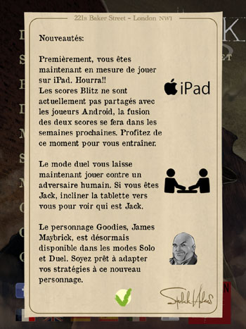 Bien que je ne sois pas un fanatique de ce type de jeu, je dois avouer que l’application m’a convaincue dans l’ensemble. Bien sur ce n’est pas très folichon, sombre (je l’ai déjà dit non ?), on pourrait même dire « froid », en tout cas tout cela ne respire pas la joie de vivre (en même temps on parle d’un assassin qui éventrait ses victimes dans un des quartiers de Londres les plus pauvres), mais tout de même, nous sommes là pour nous amuser, pas pour déprimer devant notre écran…