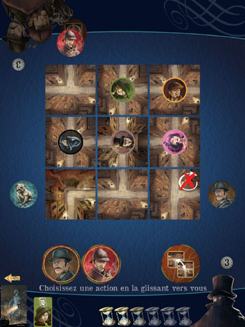 Vous glissez l’icône de l’action souhaitée vers vous pour la déclencher ou la remettez devant le plateau si vous changez d’avis. Vous sélectionnez l’endroit où vous souhaitez déplacer votre détective d’un simple tap (ou glissement) sur les emplacements possibles qui vous sont proposés ou bien vous glissez la tuile d’un quartier vers un autre pour les échanger… Bref tout est intuitif et sans à-coups.