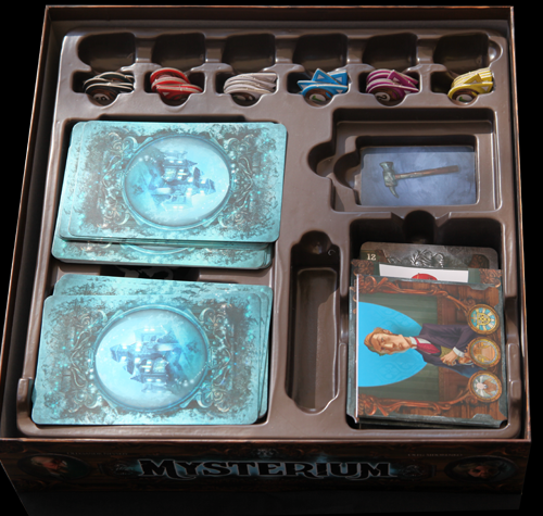 Quant au thermoformage, il déroute un peu, mais une fois apprivoisé, contiendra tout le matériel avec malice, facilitant ainsi l’installation et le rangement du jeu. Rien n’a été laissé au hasard dans Mysterium et si ce n’est une horloge compte-tours un peu bancale sur son support, on a affaire à de la qualité.