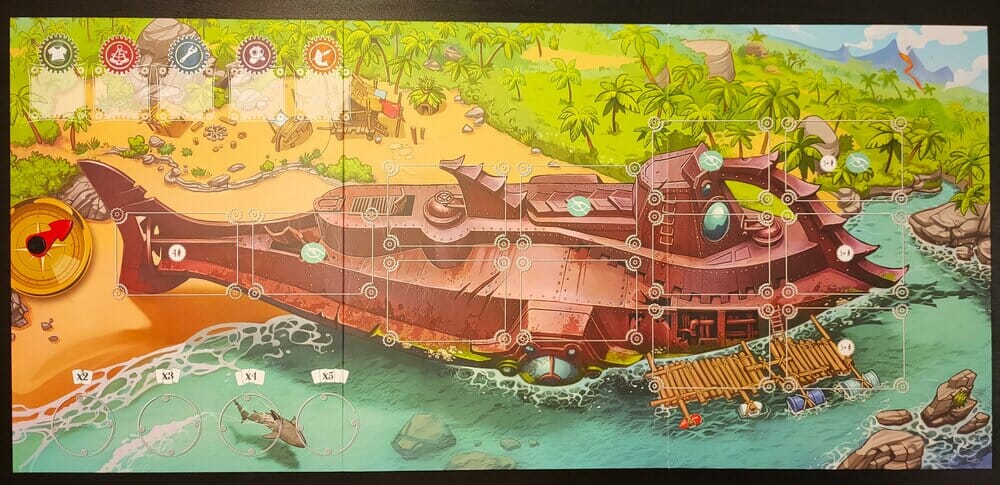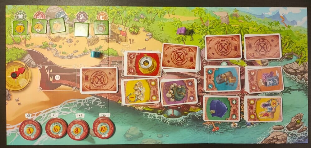 Sur le plateau, représentant le sous-marin, sont placés divers tas de cartes (face visible ou cachée) disposés en colonnes de 1, 2 ou 3 tas. À chaque manche, on déplace son Meeple naufragé en face d’une colonne, et au choix : on pioche la première carte de chaque pile ou bien on pose depuis sa main autant de cartes que de tas constituant la colonne.