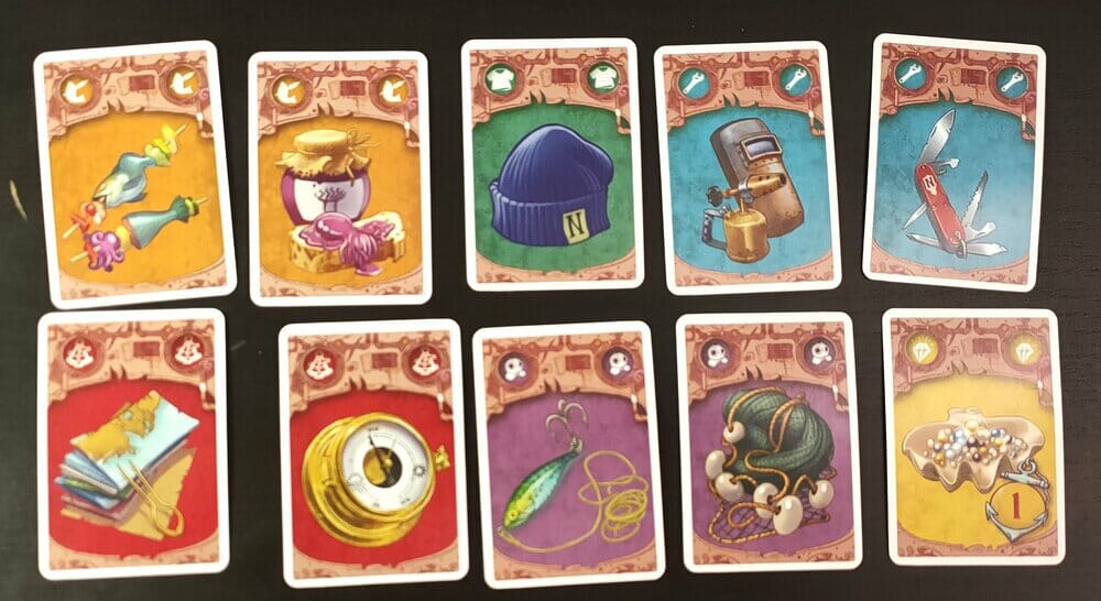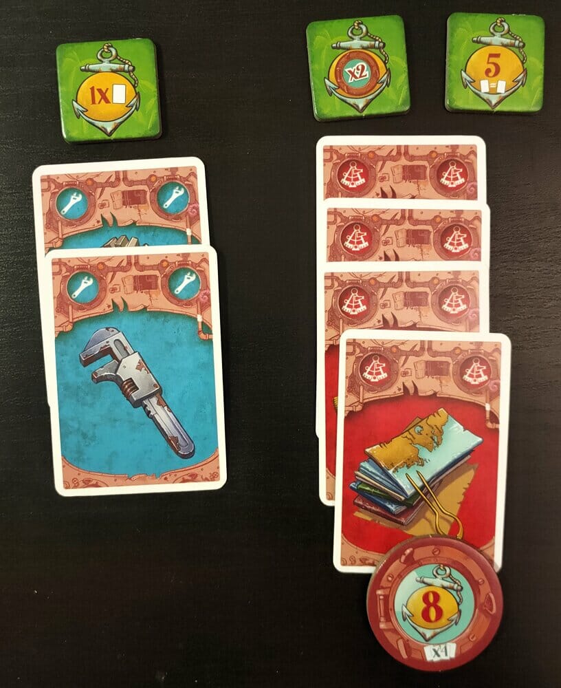 La seconde façon de marquer des points est de décider de clôturer une collection en posant un hublot dessus. Par contre, il ne sera plus possible de poser de cartes de cette couleur pour le reste de la partie, et toutes les cartes de cette catégorie que l’on piochera ultérieurement seront des cartes mortes. À l’instar de Jaipur, plus on tarde à récupérer un jeton hublot, moins il y a de points à la clé. Mais attention, si on renonce au hublot pour une collection de 4 cartes par exemple, dans l’espoir de remporter plus tard le hublot pour une collection de 5 (rapportant plus de points), mais qu’on n’y arrive pas avant la fin de partie, c’est trop tard pour revendiquer le premier hublot (un principe qu’on a déjà rencontré dans Augustus, entre autres).