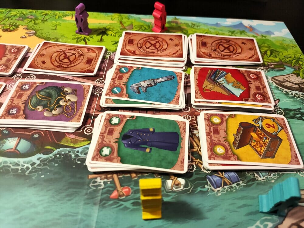 En termes d’ergonomie, je trouve dommage que les piles de cartes cachent le sous-marin. L’illustration n’est pas du tout mise en valeur. De même, les piles sont proches les unes des autres, ainsi on a tendance à tout faire bouger quand on pioche et donc voir les cartes du dessous, révélant la couleur de ce qui va arriver. Mes camarades de jeu ont regretté que le thème soit plaqué : cette collecte d’objets pourrait avoir lieu dans n’importe quel univers et pour n’importe quelle autre raison que de quitter une île. La couverture de la boite montre un volcan en éruption, mais on ne sent pas tellement d’urgence dans le jeu (sauf lors de la toute fin).