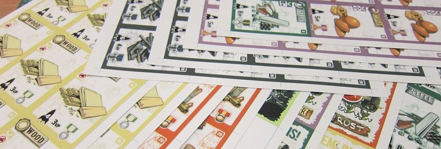 Pour revenir au matériel en termes de contenu plus que de bricolage, on a donc 105 cartes parmi lesquelles un deck de cartes Matériau de 84 cartes (de la rouille, du bois, du fer, du cuivre, de l’acier et du chrome en quantités variables, les plus lucratives étant naturellement les moins représentées), un deck de cartes Gremlins de 20 cartes et une carte unique Gremlin Vagabond.