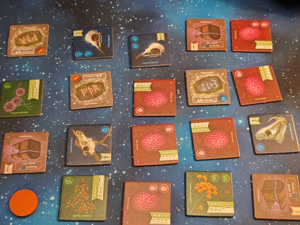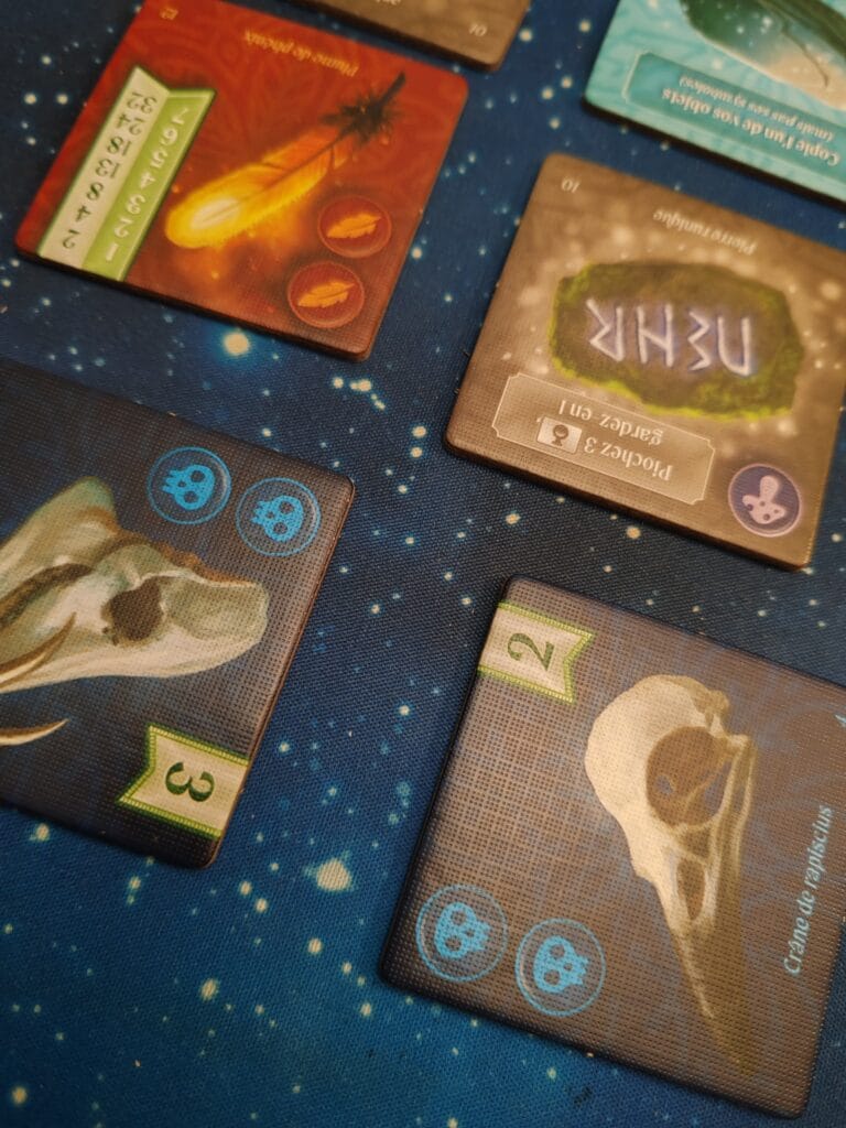 - Enfin, les Trésors Maudits sont des tuiles négatives qui font perdre des points, mais permettent de piocher une tuile. Les Pierres Runiques permettent de piocher de nouveaux objectifs personnels.