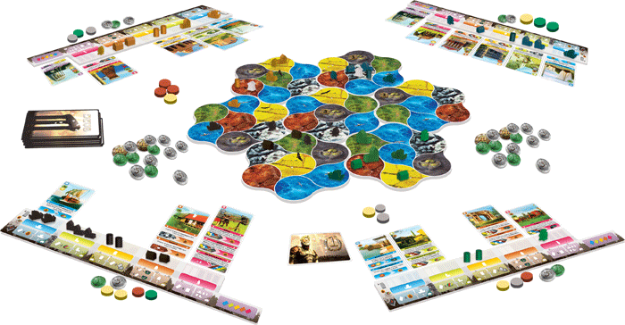 Au centre de la table, vous avez un plateau de jeu constitué de plusieurs grosses tuiles colorées. Chaque tuile est composée de plusieurs régions : 2 maritimes, 1 village et 4 régions terrestres diverses (certaines produisent du blé, d’autres du bois, de l’argile et vous avez enfin les montagnes qui produisent de la pierre pardi).