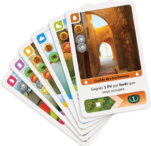 – Construire un bâtiment : vous jouez une carte Bâtiment et vous posez la pièce associée dans une région du plateau. Votre carte doit être placée dans la colonne correspondante de votre tableau et vous pourrez ensuite profiter du pouvoir de toutes les cartes de cette même colonne, en les activant de bas en haut. C’est là que vous comprendrez peu à peu l’ampleur des combos possibles ! Les bâtiments permettent entre autre de gagner des points de victoire.