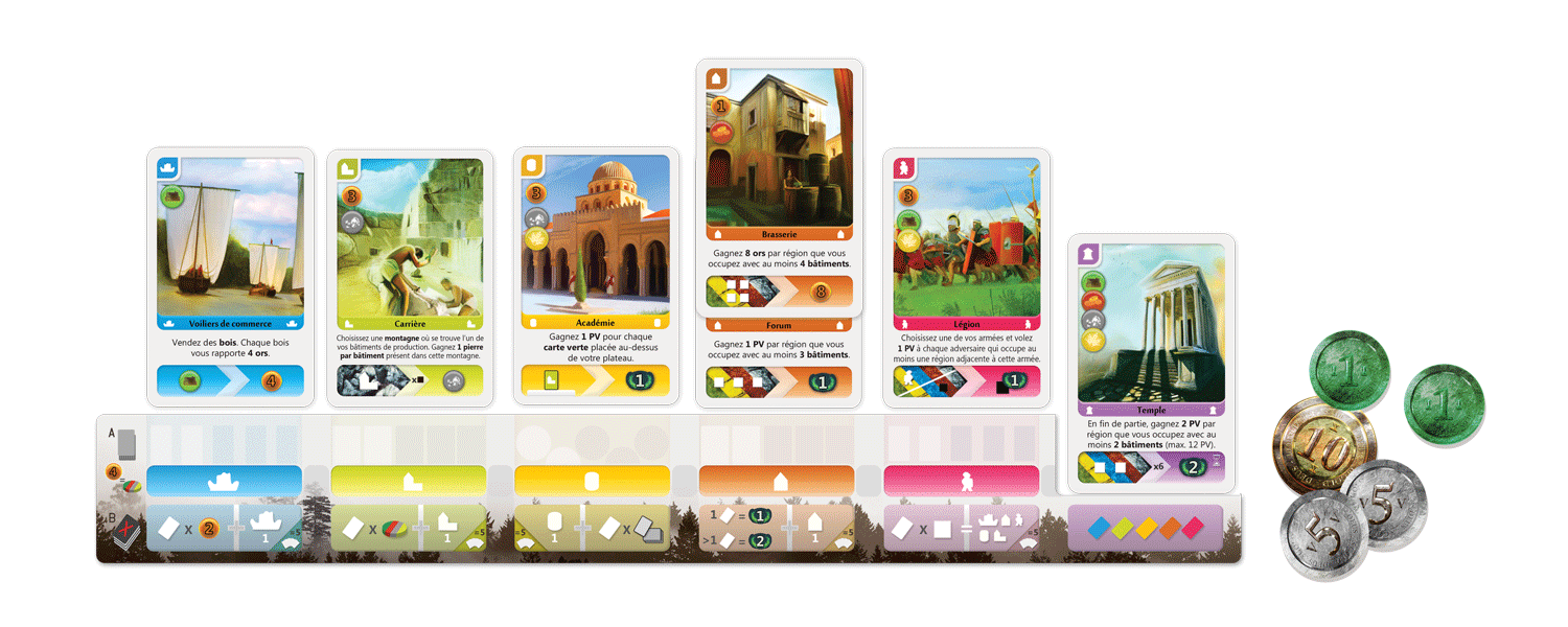 Les cartes représentent donc des bâtiments, il y en a de 6 types différents, et chacune a son pion (‘pion’ au sens large, ça peut être un petit bateau, un meeple, un temple comme vous pouvez le voir ci-dessous…) et sa couleur. Vous avez les bâtiments de production, les bâtiments maritimes, scientifiques, militaires, civils et, un peu à part, les temples.