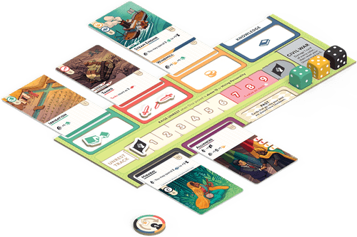 S’en suivra ensuite un jeu de pose de dés (pose d’ouvriers) où chacun·e dépense un dé à la fois dans le but d’effectuer une des actions principales du jeu, à savoir : développer une technologie en payant les ressources nécessaires, obtenir des ressources, embaucher une personnalité, étendre votre territoire, réduire l’agitation, etc. Les axes de scoring s’orientent autour de la diversité et la majorité de vos technologies développées et des territoires en votre jeu, tout en répondant aux objectifs des personnalités. Une fois les dés dépensés, on vérifie si des terribles catastrophes se déclenchent (vous pouvez y répondre par des technologies) après quoi on passe à la phase de production pour obtenir des ressources et on ajuste au passage la piste d’agitation (vous ne voudriez pas qu’une guerre civile se déclenche).