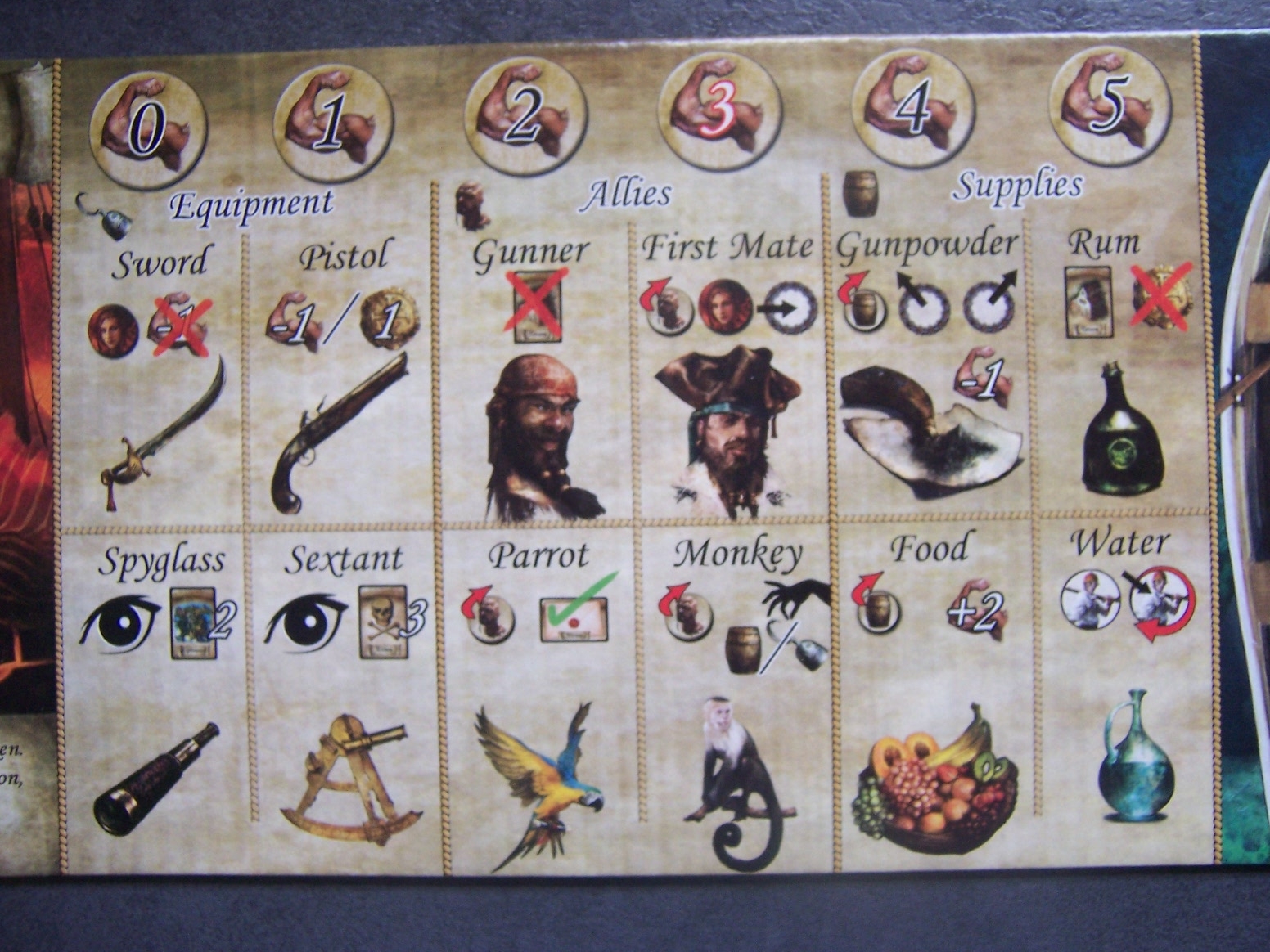 - Monckey : Quand vous allez sur la seconde place d’un emplacement avec votre capitaine, vous pouvez défaussez le jeton qui est sur le monkey pour voler une fourniture ou un équipement au joueur qui est sur le premier emplacement.
