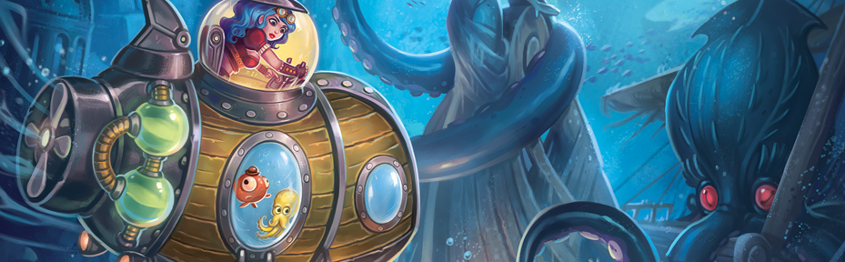 Les decks d’Explorations changent en fonction de la manche, il y en a donc trois différents, comprenant plus ou moins de cristaux, de trésors, de coraux, d’animaux de plusieurs espèces, etc. Tout ceci va marquer des points de diverses façons (placement, collection) à la fin de chaque manche et en fin de partie. On va par exemple tenter de recréer la grande barrière de Corail, orthogonalement, en posant la plus grande série de cartes consécutives avec des coraux. Les scaphandriers, eux, remonteront à la surface en ramassant des trésors de bas vers le haut. On remportera également 2 points par animal différent, mais gare à l’oeil de Kraken (que l’on retrouve dans Sea of clouds) : il ramènera des pénalités à celui qui en possédera le plus.