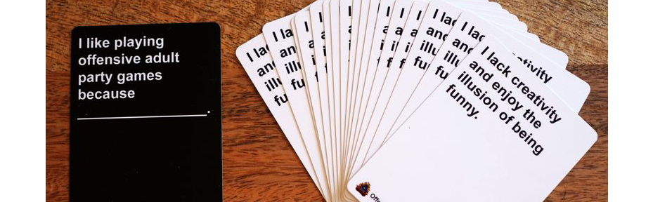 3 à 18 joueurs reçoivent chacun une carte blanche (identique) qu’ils devront associer à une carte noire (identique). Oui, oui, une partie dure 1 minute. Le début de la phrase est invariablement « J’aime jouer à des jeux offensants pour adultes parce que… » et vous complétez toujours par « … Je manque de créativité et j’aime avoir l’illusion d’être drôle. »
