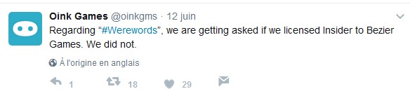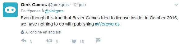 Oink Games, l’éditeur japonais d’Insider, reproche publiquement à Bezier Games d’avoir plagié leur jeu Insider pour créer Werewords, qui doit être publié cet été.