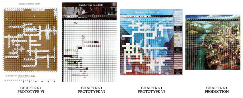 Un anagramme comme défi final ? Non, ça ne marche pas (enfin pas pour le moment et pas en l’état). Des coordonnées à gratter pour débusquer les lettres du mot d’une énigme ? Non, ça prend bien trop de place précieuse dans le haut de la grille. Rabattons cela plutôt à droite de la grille. Oui mais alors, les joueurs sauront combien il y a d’énigmes et s’ils en ont raté ! Ok, on bouge ça sur une grille indépendante. Des flèches pour marquer le début / fin des mots ? Non, ça prend trop de place dans la cellule et quand il y en a 2, ça mange sur la lettre. Etc, etc, etc.