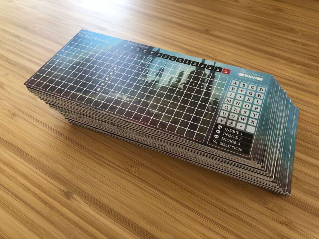 Au terme de plusieurs semaines de travail (et de désaccords nourris), nous avons réussi à accoucher d’un prologue et d’un premier Chapitre, histoire de dimensionner la durée de nos épisodes, évaluer le challenge que cela pourrait représenter pour un joueur lambda, testé différentes mécaniques liées à notre grande grille d’encre à gratter. Mais le format tel qu’on le connaît aujourd’hui est né d’une longue et profonde recherche, errance, construction, déconstruction et des dizaines de tests de nos cobayes préférés (nos familles).