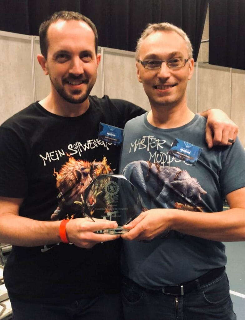 Le “jeu narratif à gratter dont vous êtes le héros” remporte le prix et amène à notre table plusieurs éditeurs désireux de signer le jeu. Nous repartons dans nos Vosges avec une euphorie inégalée, des étoiles plein les yeux et nous nous délectons des commentaires de quelques sceptiques venus tester en secret et désormais convaincus. Un grand moment pour les deux “potes à la compote”.