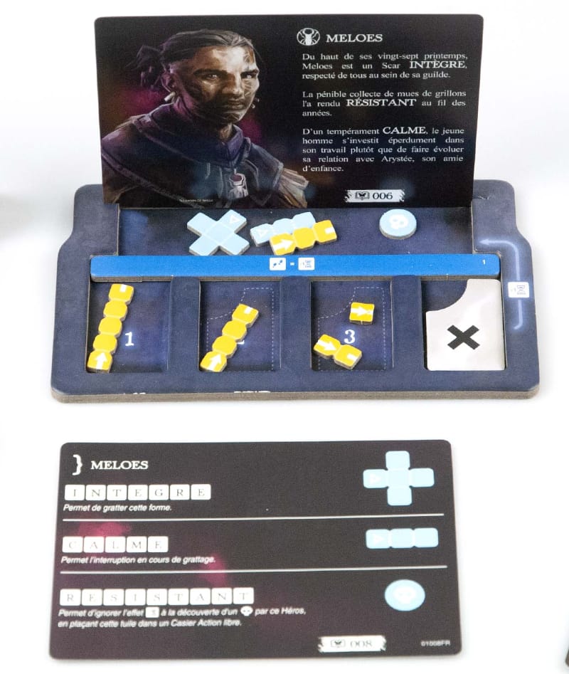 Alors, c’est un mot qui certes poursuit l’intrigue, mais permet de faire progresser les personnages en cochant ses lettres dans les traits de nos personnages (je viens de découvrir le mot {AUVENT} ? Je peux cocher certaines lettres de mon personnage ayant le trait JOVIAL, et démarrer celui qui est SÉRIEUX).. Trouver toutes les lettres d’un trait du personnage lui débloquera un nouveau polyomino ou un nouveau pouvoir, très utile pour aller plus vite, pour gratter plus, plus loin.