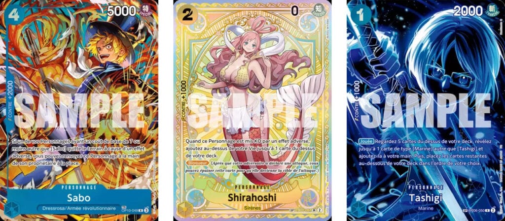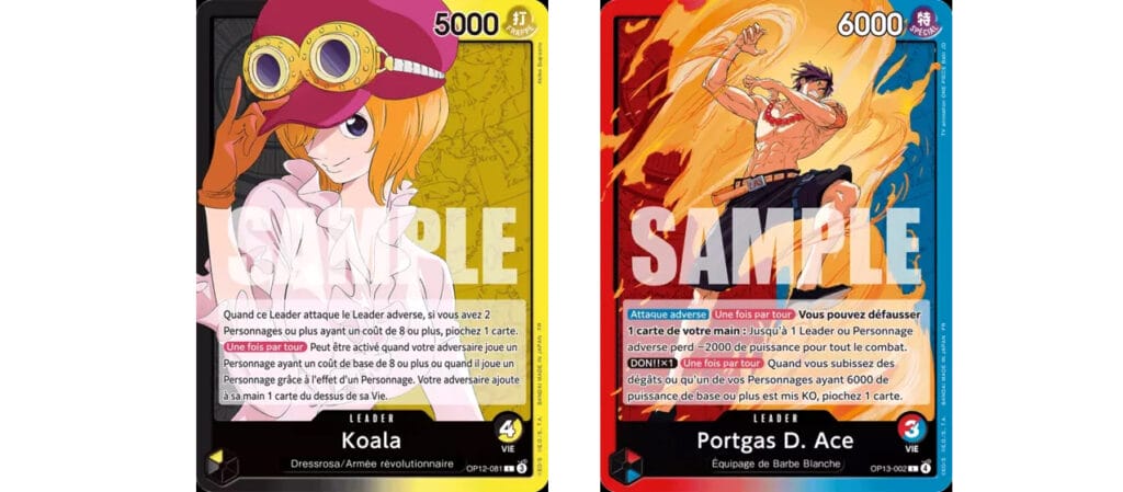 Chaque set voit également son lot de 6 nouveaux leaders arriver. Je ne l’avais pas remarqué au tout début, mais le fait qu’ils aient un nombre de points de vie diffèrent, qui s’équilibre avec la puissance de leur pouvoir, est un effet mécanique très intéressant. Lors de la construction de notre paquet, on pourra choisir, outre les synergies couleur et thème, le fait d’avoir un personnage avec un pouvoir très intéressant, mais il faudra prendre le risque d’avoir moins de PV que son adversaire.