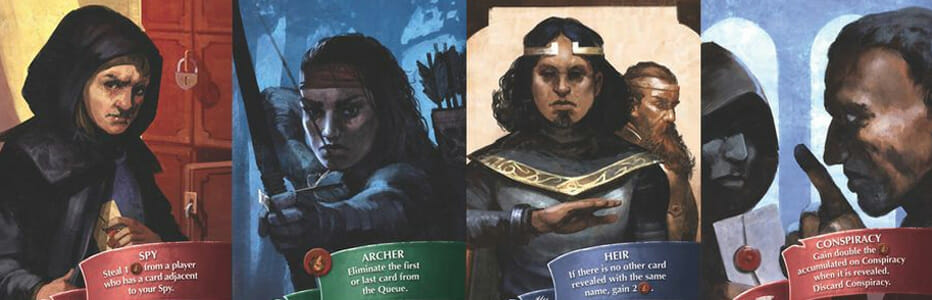 Parlons des illustrations d’ailleurs avant d’aller plus loin, car elles sont sujettes à pas mal d’avis contradictoires. De style clairement mature, afin de respecter le thème du jeu (assassinats et complots au menu) elles ne font pas l’unanimité, car il faut avouer, sont assez disparates. Le jeu tient en 10 illustrations différentes, qui sont pleinement représentées sur la quasi totalité de la carte, ce qui permet de bien en profiter. Certaines sont à mon sens vraiment magnifiques (le seigneur, le soldat…) quand d’autres sont bien moins léchées (l’espion, le décret royal…). Pour un jeu où l’on passe le clair de son temps à regarder ses cartes, et donc les illustrations, on aurait aimé des dessins tous irréprochables, et cette petite fluctuation de qualité (mariée à un style qui ne plait pas forcement à tous), fait qu’il y a quelques réticences régulièrement lorsque l’on présente le jeu à de nouveaux joueurs. Personnellement je ne trouve pas ça renversant, mais c’est très loin d’être vilain à mes yeux. La couverture de la boite n’est pas non plus hyper avenante, même si elle annonce la couleur de l’ambiance, elle n’aide parfois pas forcément à « vendre » le jeu.