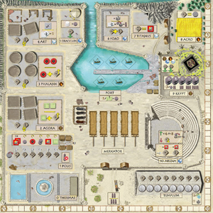 Voilà, chaque joueur dispose d’un pion (désignant le maître) et de 5 dés (désignant les disciples), le plateau représente la ville de Corinthe avec ses 10 emplacements et nous avons aussi pleiin de tuiles qui servent à pleiin de choses. Regardons cela de plus près.