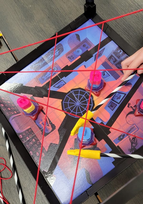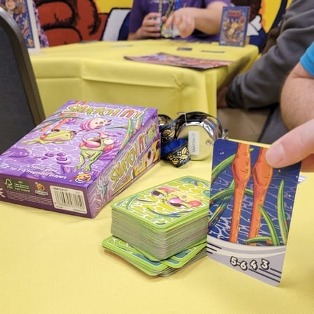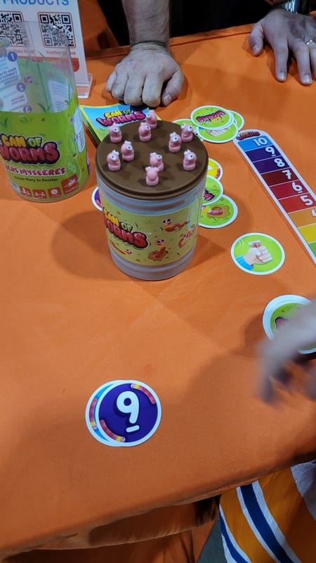 Chez Foxmind, l’éditeur canadien, nous avons joué à Vers Mystère ! La cannette est trouée et chaque trou contient 1 ver de terre de taille différente. Comme à la courte paille, on ne sait pas vraiment ce qu’on va piger comme ver et il faut trouver des vers de la taille souhaitée par la carte que vous avez reçue.