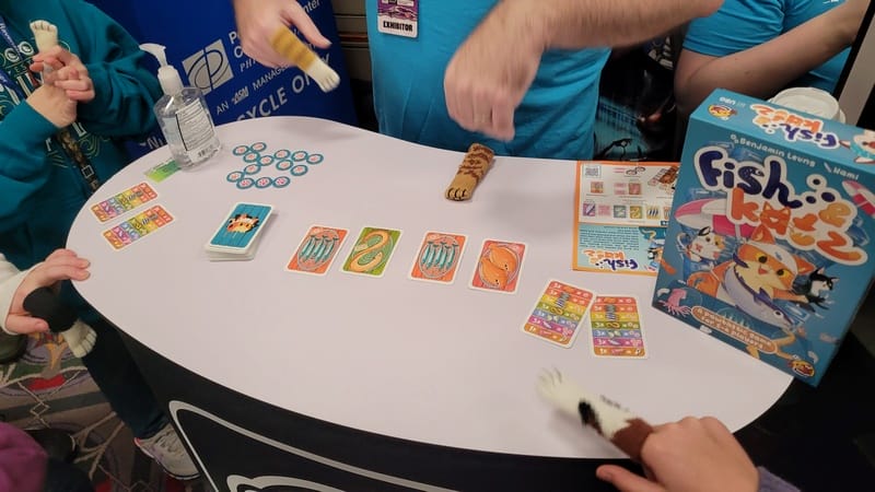 Un titre dans la catégorie des jeux familiaux de rapidité. Ici, vous allez pointer une carte comportant des poissons tous ensemble, habillés de mitaines de doigt en guise de patte de chat !