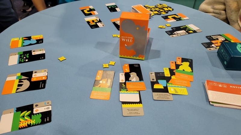 Oink Games demeure un passage obligé à chaque PAX. Cette année, ils présentaient Moving Wild, un jeu de draft pur avec pour but de réaliser un écosystème rempli d’animaux exotiques. Chaque carte peut être un animal, un habitat ou une amélioration d’un habitat. Après chaque tour, les joueurs réorganisent leurs animaux pour obtenir le plus grand nombre de points possible.