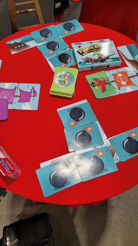Pirate blast rentre dans la catégorie des jeux franchement simplistes : on retourne une carte et … on subit. Ceci s’applique ici à des pirates qui s’envoient des boulets de canons avec leurs singes. La partie dure 5 minutes.
