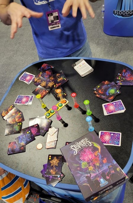 Nous avons pu tester la suite de Kites, le jeu coopératif frénétique de sabliers de Kevin Hamano. Skyrocket, c’est Kites sous stéroïdes (en France sous le nom de Fireworks, paru chez Matagot) ! Les joueurs jouent à tour de rôle des cartes afin de retourner les sabliers correspondants sans qu’aucun d’entre eux (de durées variables) ne s’épuise. 25 défis plus déjantés les uns que les autres pour réaliser un feu d’artifice de couleurs. Plus complexe que son ainé, il en reste un jeu parfait de salon avec un bon animateur. Très plaisant.