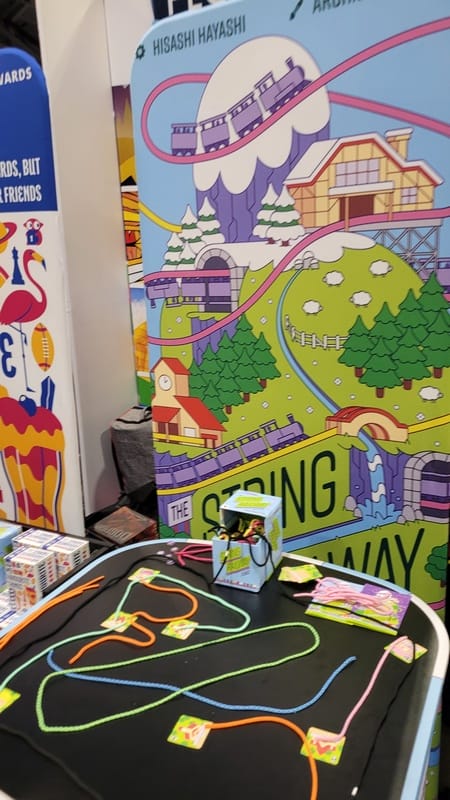 J’ai découvert ce Hisashi Hayashi datant de 2009. Des lacets pour délimiter le terrain de jeu ? Curieux. String railway propose une sorte de jeu de dextérité à l’horizontal. Vous placez un petit cercle de ficelle pour représenter les montagnes et une ligne de ficelle pour représenter une rivière. Chaque carte nous propose quelques contraintes et on peut un peu embêter ses adversaires. Lors d’un tour, vous tirez et placez une tuile de gare, puis vous essayez de placer une ligne de chemin de fer entre vos gares afin de les relier et de former votre propre réseau ferroviaire. Les gares connectées rapportent des points de victoire.