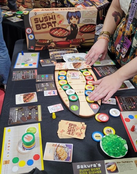 Chez Japanime Games, impossible d’avoir plus d’information sur une possible extension à l’excellent deck-building familial Cowboy Bebop. Malgré tout nous nous arrêtons sur Sushi boat, un jeu au matériel impressionnant figurant un bateau de sushi ! Côté jeu… pas grand-chose à se mettre sous la dent malheureusement. Un petit jeu de pose d’ouvriers et de collection classique. Je passe.