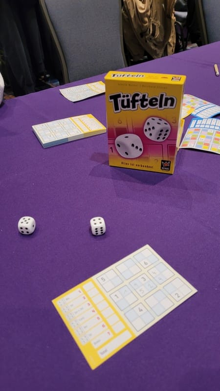 Revenons aux sorties tout droit venues d’Essen avec ce petit jeu de roll and write abstrait. Tüfteln qui a priori signifie « bricoler » en allemand. Un jeu qui ne paie pas de mine et offre un casse-tête intéressant bien qu’un peu limité à mon humble avis. Les joueurs inscrivent simultanément (Comme dans Tres Futé) une paire de dés dans deux cases blanches ou deux cases bleues. Le score est basé sur des mains semblables à celles du Poker. Ça fonctionne, sans plus.