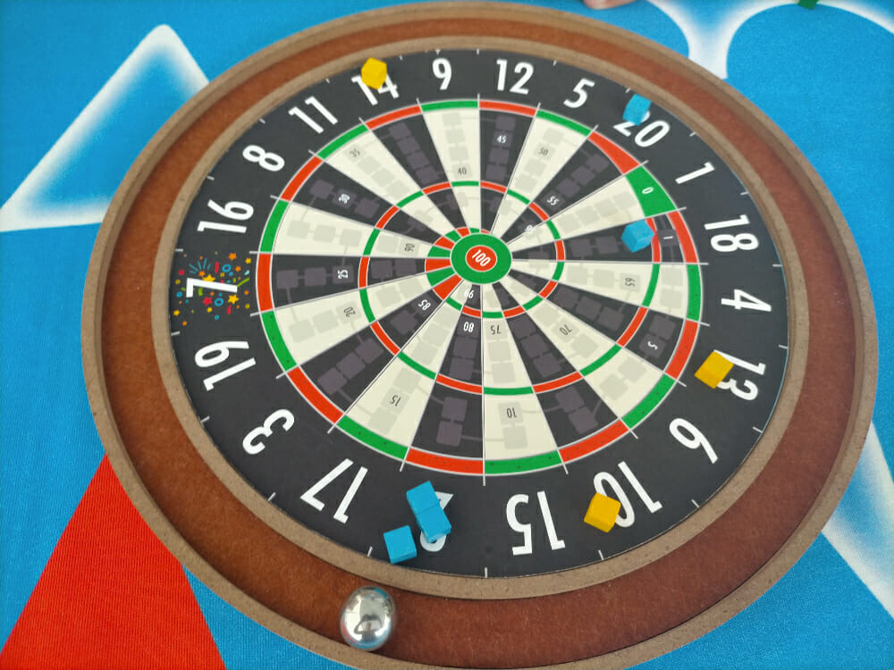 De loin, Circles ressemble à une cible de fléchettes posée sur une table. De près aussi d’ailleurs, à la différence tout de même qu’il y a autour de la cible un cercle en plus, dans lequel on va pousser une bille. Voila, le jeu c’est ça : à son tour on pousse la bille dans un cercle, si elle a au moins fait la moitié du cadran et qu’elle arrive au moins en face, on va mettre un de ses petits cubes de sa couleur sur la zone d’arrivée, et ça fera les points de la zone, entre 1 et 20, comme aux fléchettes. Si on arrive sur la zone où un cube adverse est présent, on le vire. On fait plusieurs manches et le premier arrivé à 100 points remporte la partie, sauf si un joueur est assez adroit et expérimenté pour mettre trois cubes lors de la même manche dans la même zone.