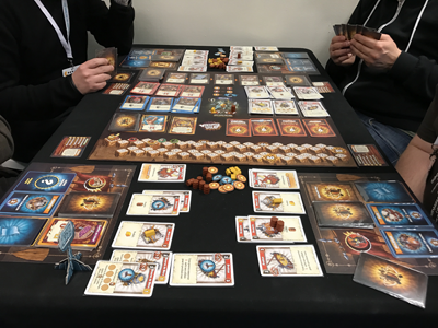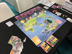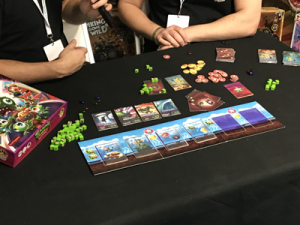 Le proto mystérieux de chez Pixie Games s’intitule provisoirement « Phoenix Cup ». Le proto est en cours de finalisation et le plateau attirait effectivement l’œil. Le jeu parle d’étudiants-sorciers qui acquièrent des points de savoir… à suivre !