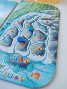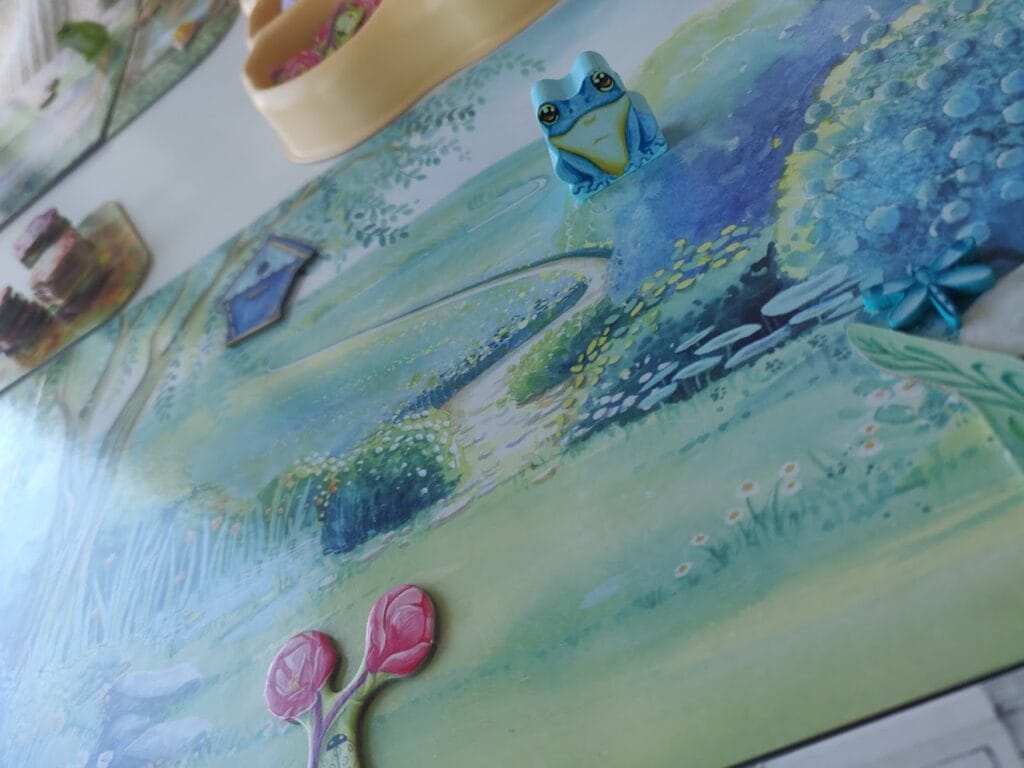 Mécaniquement, le jeu est très accessible. Presque trop simple. Cela permet aussi des tours rapides sans trop de temps morts, sur une durée d’une petite heure. La prise en main est rapide, mais il faut appréhender les différentes manières de marquer des points. Cela peut sembler beaucoup au premier abord, mais cette impression s’efface très rapidement, particulièrement avec l’aide de jeu qui synthétise très bien les arbres de choix. Nous aurons évidemment envie d’avancer sur les différents plateaux du jeu (les plantes de votre jardin, la mare aux nénuphars, la cascade), mais c’est là que réside l’essence du jeu : choisir ses axes de progression et éviter de trop s’éparpiller. La fin du jeu sera tout de même une belle salade de points, dont il est difficile de déterminer le vainqueur avant le comptage final.