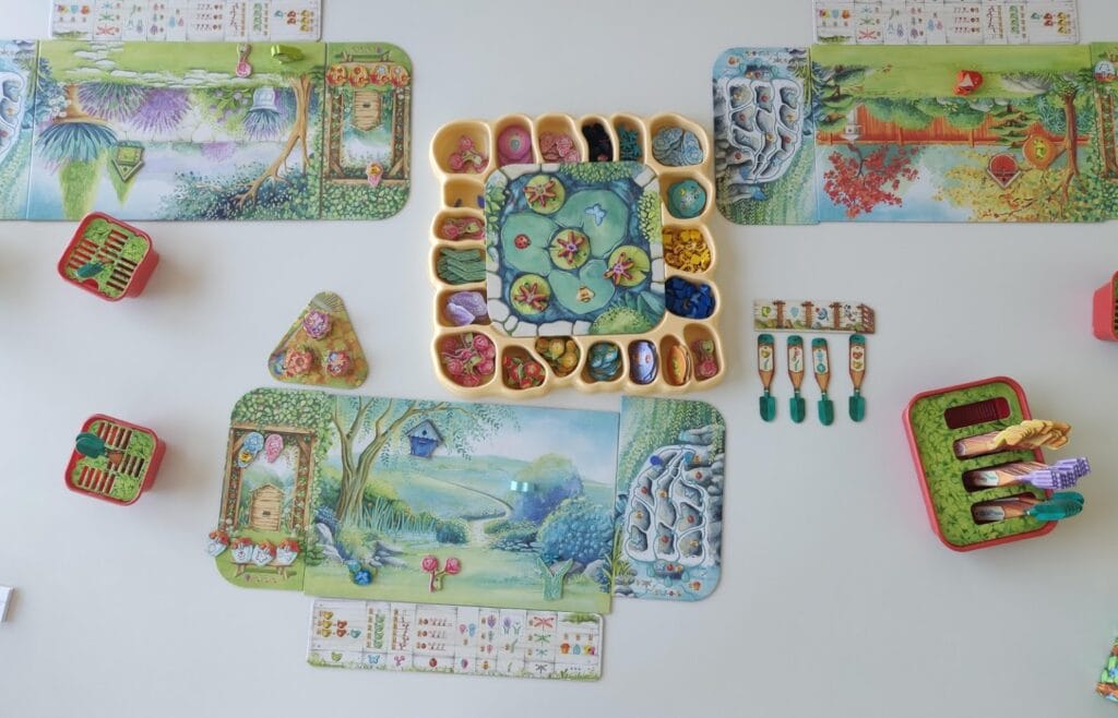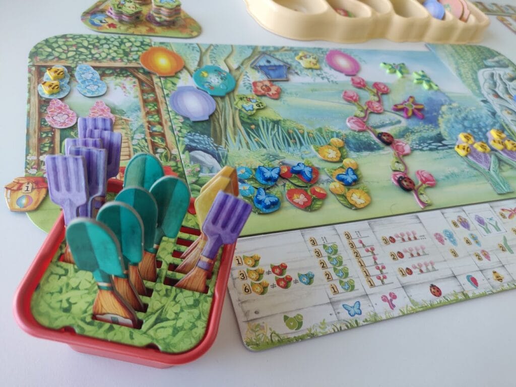 Plutôt simple d’accès, ce jeu propose à chaque joueur de construire son petit coin de paradis, à partir d’une multitude d’éléments floraux. Le tour de jeu se résume à récupérer un outil parmi ceux disponibles. Celui-ci vous donnera 2 éléments floraux ou insectes à placer dans votre jardin, puis faire l’action spéciale associée à l’outil. Si le jardinage pouvait être aussi simple !