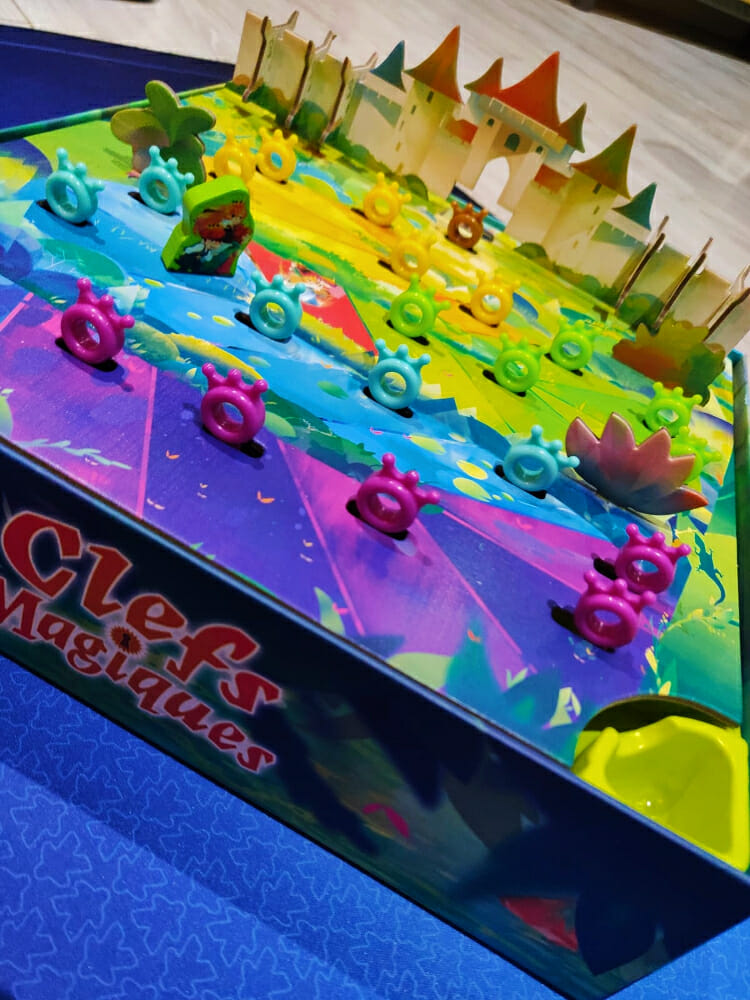 Un coffre rempli de rubis, des clés pour ouvrir ledit coffre dans un univers féerique. En faut-il plus pour combler un p’tit joueur ? Probablement pas. Clés magiques est un jeu où il va falloir récupérer un certain nombre de gemmes, toutes dans un seul et même coffre. Un coffre fermé bien entendu. Ça tombe bien, nous avons plein de clés colorées à notre disposition. Mais toutes ne vont pas fonctionner. Clés magiques rentre dans la catégorie des jeux « Stop ou encore ». Un seul pion pour tous les joueurs, qui devra avancer sur un chemin sinueux, parsemé de clés. Les clés permettront, peut-être, d’ouvrir le coffre. À son tour, le joueur jette trois dés et choisit une face pour avancer le pion. Les faces « sieste » sont écartées et le joueur peut choisir de s’arrêter et tester la clé de sa case s’il y en a une, ou tenter de continuer en rejetant les dés restants.