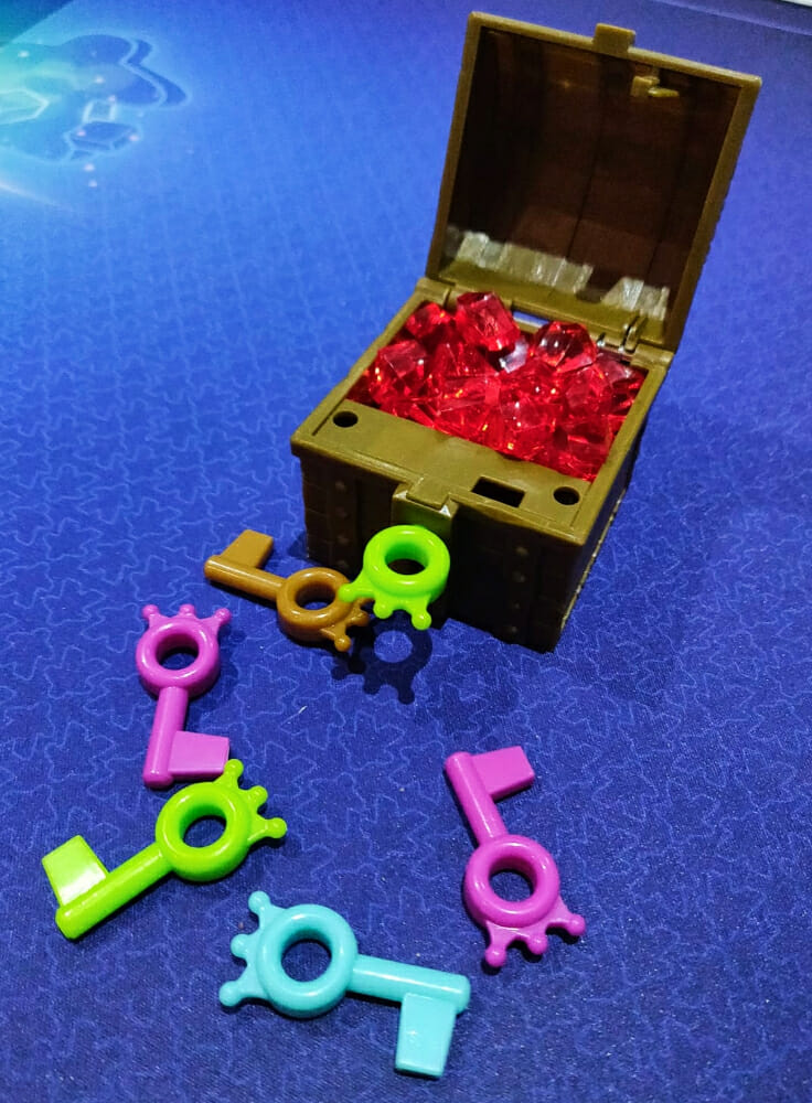 Si la clé ouvre le coffre, il pourra prendre des gemmes, sachant que plus on est loin sur le chemin, plus on prendra de gemmes. Si la clé ne fonctionne pas, le joueur la garde quand même et cela lui permettra de rejeter des faces « sieste » lors d’un tour ultérieur. Le pion revient dans tous les cas au début du chemin.