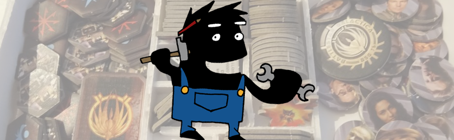 Voilà un peu le gros morceau du jour. D’abord parce que BSG, c’est du matériel en pagaille, et alors avec deux extensions, je vous dis pas. Enfin si je vous dis, je viens de le faire à l’instant. Les débuts de parties sont du coup un poil longs à mettre en place, surtout quand il faut chercher le matériel d’une extension ou d’une autre. En plus de cela, je n’ai pas acheté Pegasus, mais je ne désespère pas de le faire un jour. Et on va essayer de tout faire rentrer dans une boîte. Pfiou, ça me fatigue déjà.