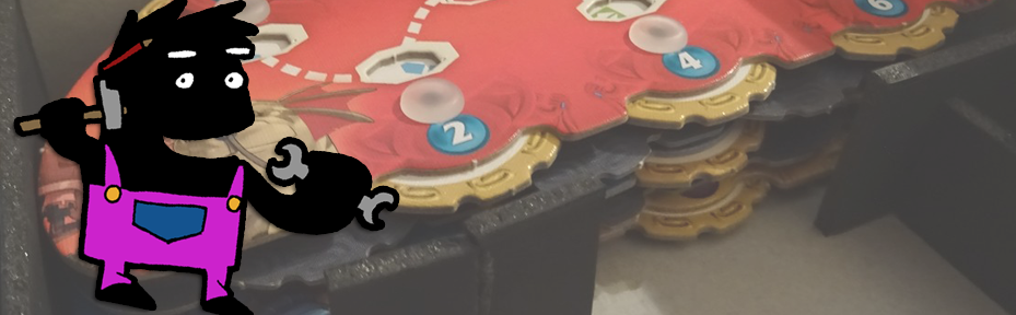 Et comme la barquette à pépètes est plus courte que les cadrants, j’ai la place de faire une barquette pour le matériel du jeu à deux joueurs, avec un petit un bitoniau pour caler les jetons colosses.