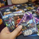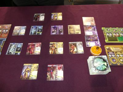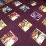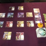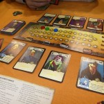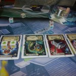 Pour cette partie d’initiation découverte à 4 joueurs, un set de base de cartes censé être équilibré est distribué à chaque joueur. Dans une partie normale, les cartes sont achetées dans une phase initiale d’enchères en dépensant nos points de vie.