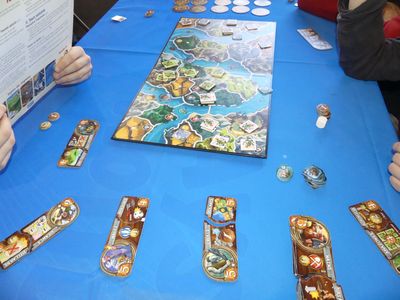 Chacun à son tour, on envoie un émissaire négocier en plaçant son disque de son plateau personnel aux points d’intersection des cartes du plateau, ce qui octroie des cubes symbolisant son influence. Si le type de l’émissaire correspond à la nature de la carte, on gagne un cube d’influence supplémentaire.