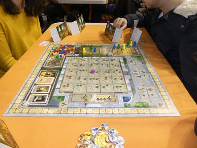 La halle étant bondé, on a terminé par un Pyramids (Iello) à la maison ! Petite boîte fraîchement acquise auprès du magasin présent sur le salon, Les contrées du Jeu. Nous voulions en réalité acheter Kingdomino mais il était alors en rupture vers la fin du week-end et Dom nous a trouvé une solution en nous proposant Pyramids.