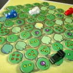 Vous débutez sur une case de valeur 1, ce qui signifie que votre premier saut vous emmènera une case plus loin. En effet, à votre tour, vous pouvez soit sauter depuis votre tuile en ligne droite d’un nombre de cases égal à la tuile sur laquelle vous êtes, soit sombrer dans une subite torpeur. Dans ce deuxième cas, vous ne bougez pas, mais vous prenez la tuile où vous êtes actuellement pour la placer dans votre réserve. Votre réserve est fortement utile au cas où vous arriviez sur des tuiles qui ne permettent pas de sauter (sans valeur) car alors vous pourrez vous défausser d’une tuile en réserve pour rebondir.