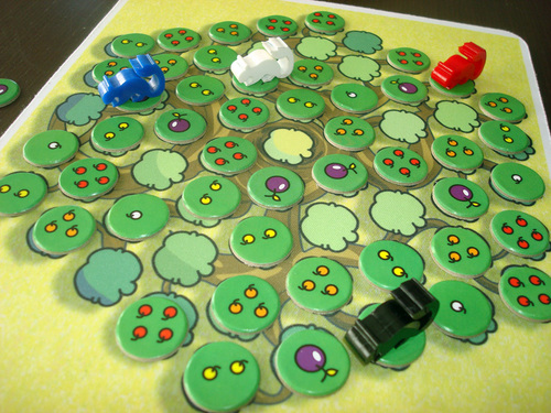 C’est bien simple. Vous avez plein de tuiles qui représentent un arbre, c’est votre zone de jeu. Chaque tuile possède un certain nombre de fruits (les fruits mauves sont les meilleurs, ils valent 5) mais parfois elles sont vides. Chaque joueur a son petit marsupial à sa couleur.