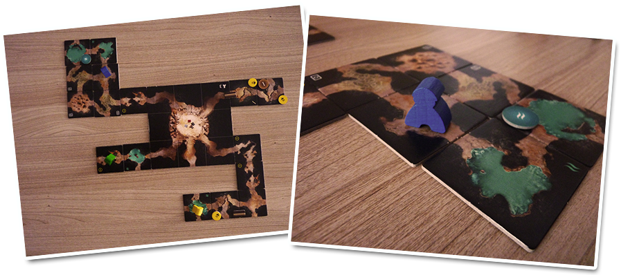 C’est terminé ! La dernière tuile a été posée, et c’est après deux effondrements successifs déclenchés par le joueur jaune, que l’aventurier vert décide de mettre fin à la partie. Il reste donc 3 tours complets à chacun pour regagner l’entrée (le spéléologue vert compte bien profiter de ce répit pour s’emparer du jeton de recherche aquatique disponible sur sa tuile) .