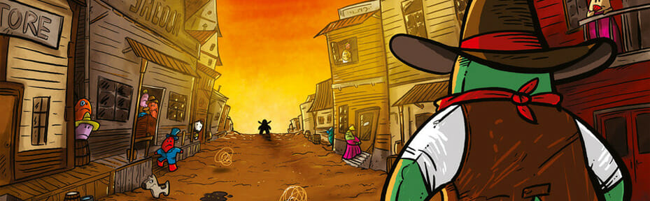 Meeple sort du saloon, les mains sur son colt, marche jusqu’au milieu de la rue poussiéreuse, se tourne vers son ennemi, et tire sans sommation.