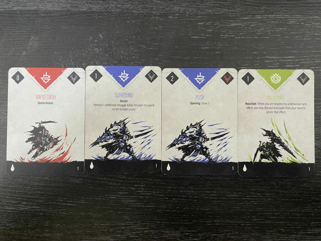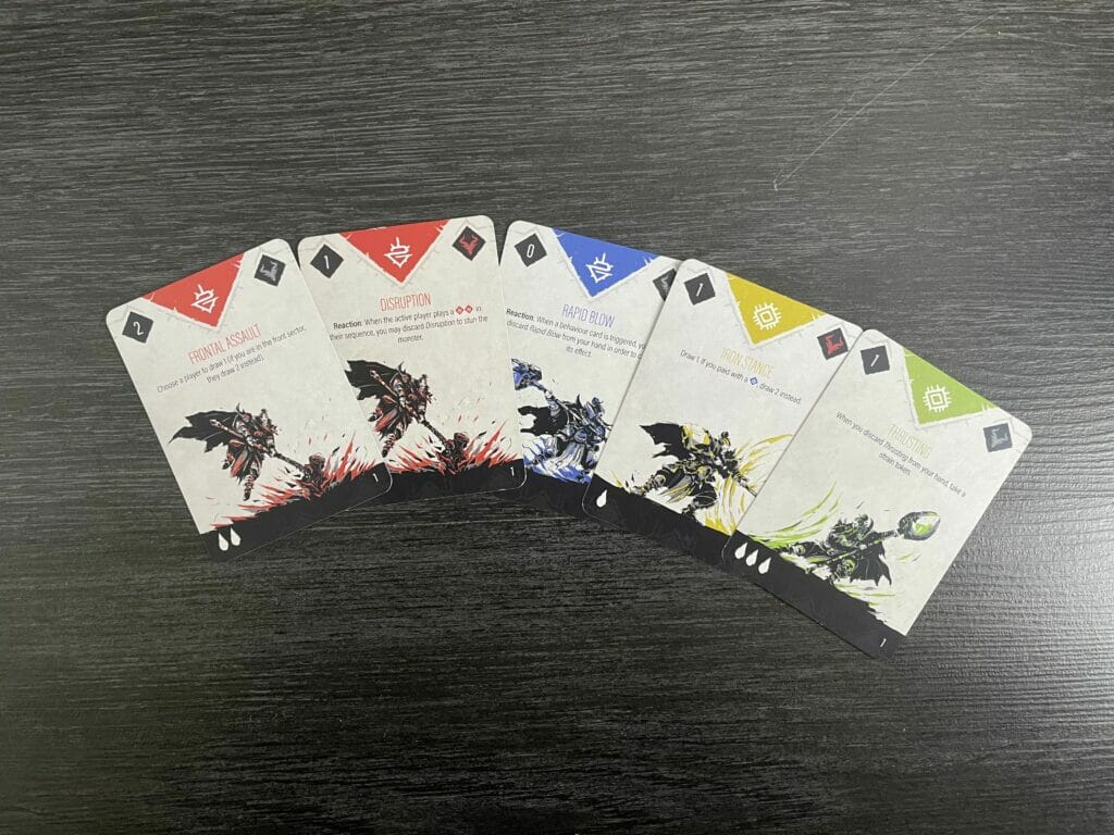 Les cartes de chaque héros sont uniques mais présentent la même structure, à savoir un symbole (indiquant une carte offensive ou défensive), une couleur, et d’éventuels effets. Chaque joueur va à son tour avoir la possibilité de jouer jusqu’à 5 cartes dans un ordre particulier, l’objectif étant de réaliser le combo le plus dévastateur possible. La plupart des actions vont vous offrir un bonus si elles sont jouées avant ou après certaines autres, transformant chaque tour en un mini-puzzle vous poussant à optimiser chaque mouvement et à mesurer chaque carte défaussée.