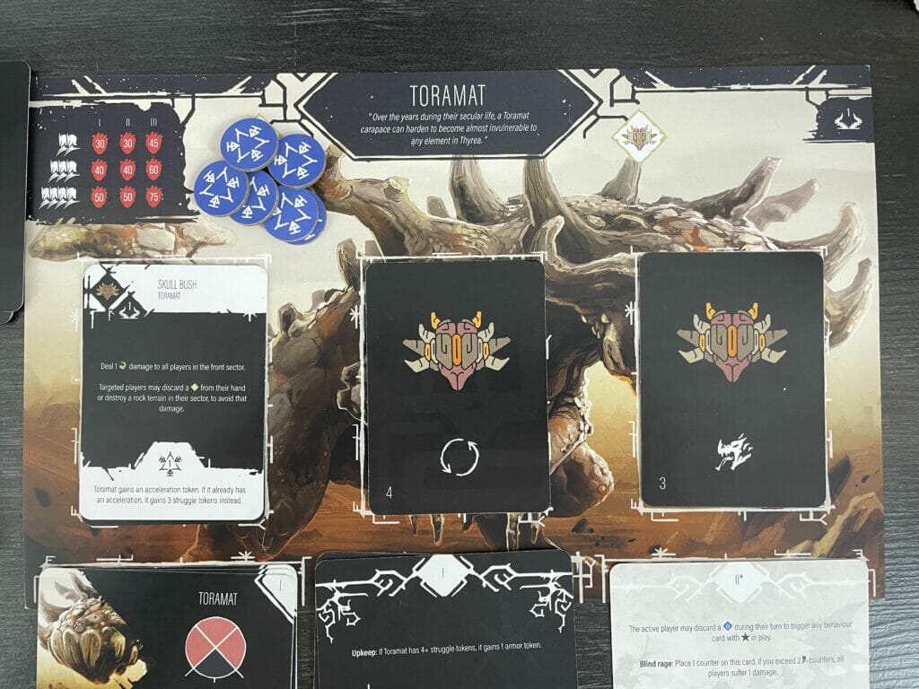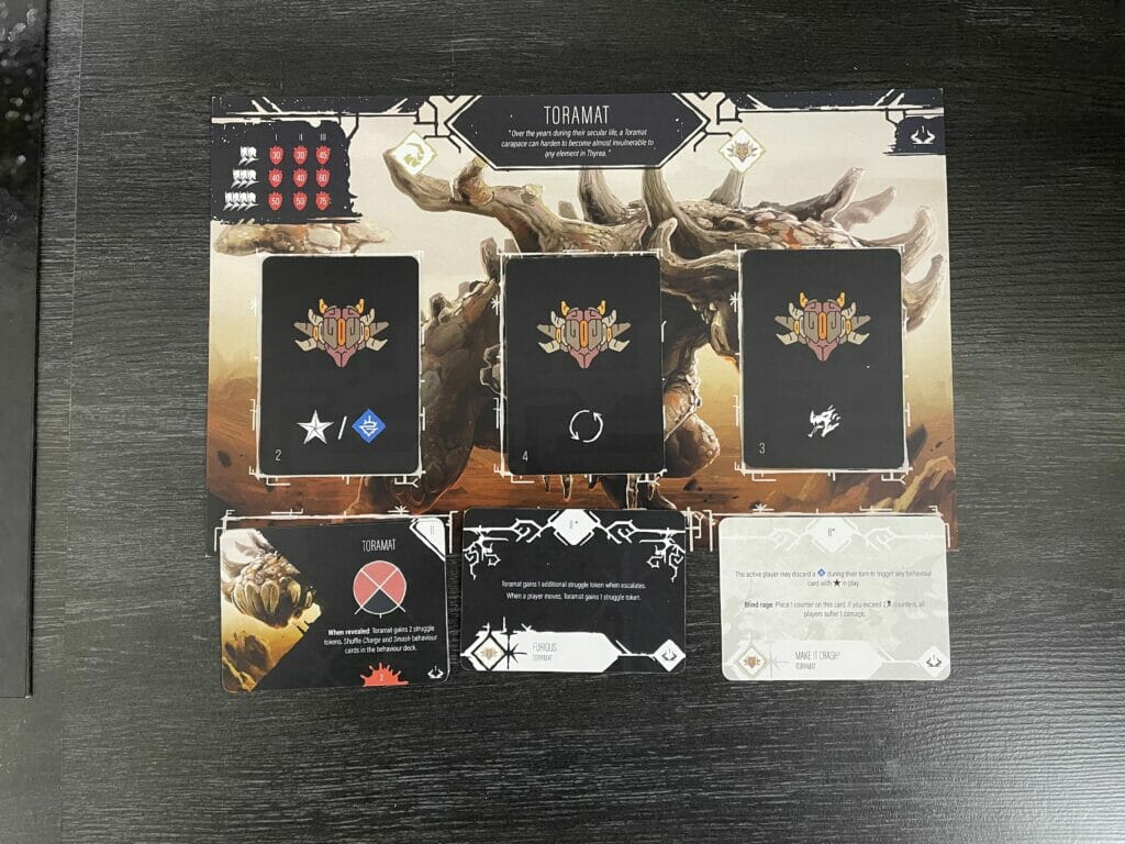 Le fait que les cartes de comportement du monstre tournent beaucoup, mais aussi qu’à certains moments de la partie il change radicalement de posture, crée une imprévisibilité permanente qui impose de devoir régulièrement changer ses plans et de s’adapter à la volée.
