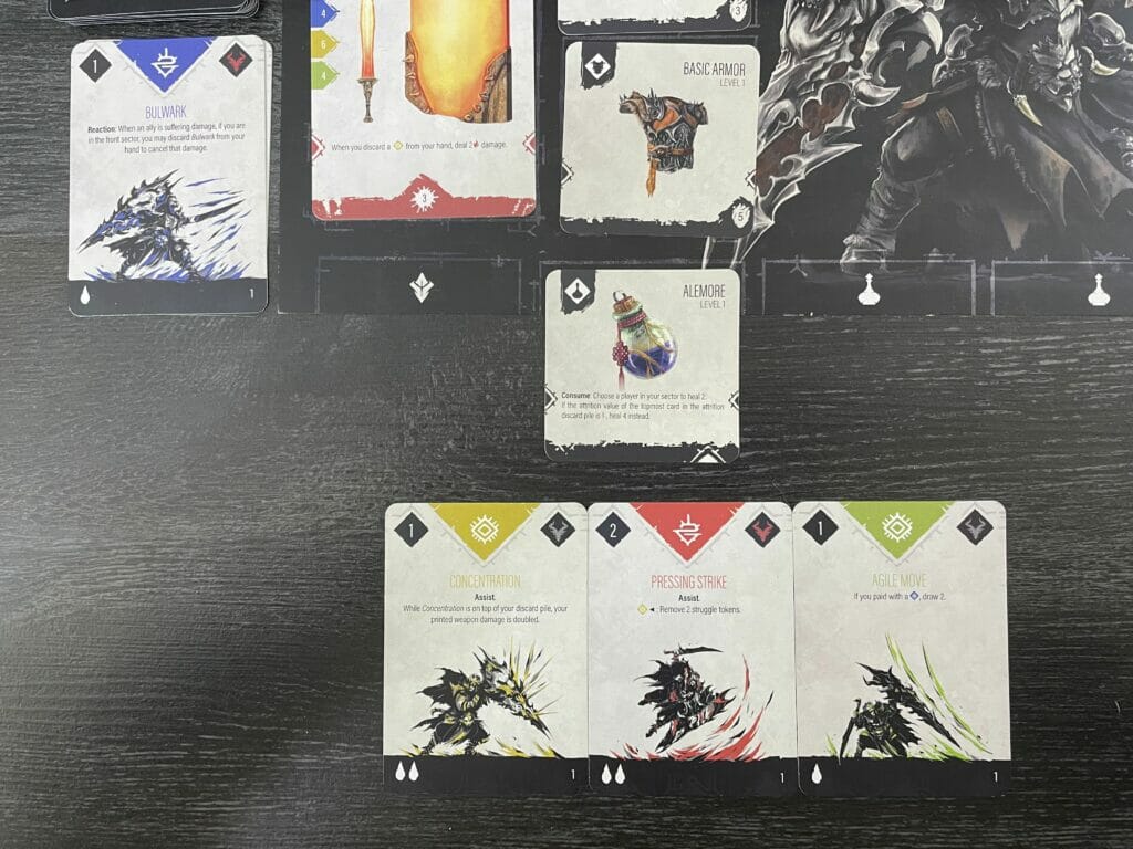Le positionnement aura lui aussi son importance, car il vous faudra vous adapter aux déplacements du monstre afin de lui infliger des dégâts et éviter qu’il ne vous attaque trop facilement. Dernier élément essentiel, vous aurez la possibilité en dehors de votre tour de défausser des cartes afin de porter assistance à vos alliés (la plupart du temps, en leur permettant de piocher). Cette mécanique, loin d’être anecdotique, renforce la possibilité de combos dévastateurs tout en permettant aux joueurs dont ce n’est pas le tour de rester impliqués dans le combat.